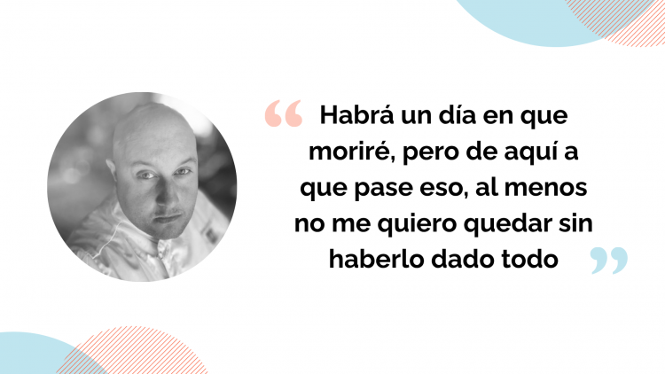 “A la vida no le vas a ganar y las cosas pasan cuando tienen que pasar. Yo me plantee cómo me iba a mí a querer nadie si yo mismo no me quería. Esto venía de un dolor que yo había sufrido intensamente y me fustigaba muchísimo. Y claro, cuando sientes ese dolor tan intenso, solo tienes dos caminos: te quedas abajo y sigues hundido o subes hacia arriba. Yo decidí subir. Habrá un día en que moriré, pero de aquí a que pase eso, al menos no me quiero quedar sin haberlo dado todo. Ahora voy a luchar por quererme, pero por quererme en todos los aspectos. Hay una frase que me gusta mucho que dice: «el que lea malos libros no se diferencia mucho del que no sabe leer». El objetivo es conseguir esa calidad en todo. En lo que lees, en lo que comes, en lo que ves por la televisión, porque todo lo absorbes. Nuestro cerebro lo absorbe absolutamente todo”.
