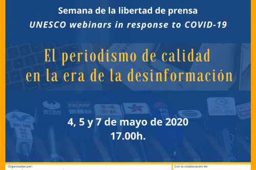 En el marco del día de la libertad de prensa que se celebra el próximo 3 de mayo, la Cátedra UNESCO de Alfabetización Mediática y Periodismo de Calidad junto con el Gabinete de Comunicación y Educación organizan un ciclo de jornadas online tituladas El periodismo de calidad en la era de la desinformaciónEl evento, que cuenta con la colaboración de la Asociación de Televisión Educativa Iberoamericana (ATEI), Altaïr Magazine e IcMedia, se llevará a cabo los días 4, 5 y 7 de mayo, a las 17.00 horas (España), a través de la plataforma Zoom.