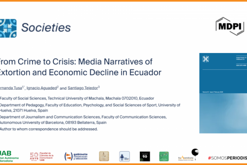 El catedrático Santiago Tejedor, director del Gabinete de Comunicación y Educación de la Universitat Autònoma de Barcelona (UAB), junto con Fernanda Tusa, investigadora del Grupo de Investigación de Comunicación de la Universidad Técnica de Machala en Ecuador e Ignacio Aguaded, del Departamento de Pedagogía de la Universidad de Huelva, firman el artículo “From Crime to Crisis: Media Narratives of Extortion and Economic Decline in Ecuador”.
