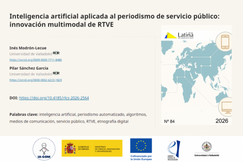 La doctora Pilar Sánchez, docente de la Universidad de Valladolid (Uva) e investigadora del proyecto IA-COM, y la periodista Inés Modrón, miembro del Laboratorio de Comunicación Multimedia e Inteligencia Artificial de la Uva, firman el artículo científico “Inteligencia artificial aplicada al periodismo de servicio público: innovación multimodal de RTVE” (2026), publicado en la Revista Latina de Comunicación Social.