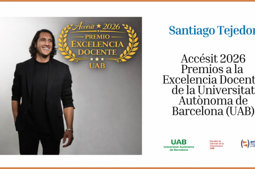 El catedrático de Periodismo Santiago Tejedor, director del Gabinete de Comunicación y Educación y docente de la Facultat de Ciències de la Comunicació de la Universitat Autònoma de Barcelona (UAB), ha sido premiado con un Accésit en la última convocatoria de los Premios a la Excelencia Docente de la UAB, una iniciativa institucional que distingue al profesorado por su compromiso con la calidad de la enseñanza, la innovación pedagógica y la mejora continua de la docencia universitaria.