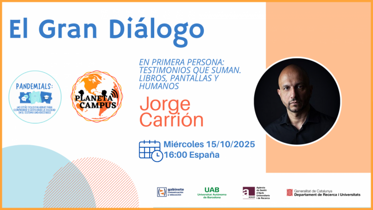 El Gabinete de Comunicación y Educación de la Universitat Autònoma de Barcelona, bajo la dirección del catedrático Santiago Tejedor, organiza la decimosexta y última sesión del ciclo ‘El Gran Diálogo’. El encuentro, titulado “En primera persona: testimonios que suman. Libros, pantallas y humanos”, tendrá lugar el próximo miércoles 15 de octubre de 2025, a las 16:00 (hora de España) y estará protagonizado por el escritor Jorge Carrión.