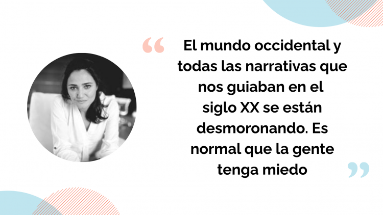 “Ahora estamos viviendo la revolución de la ciencia y la tecnología, que nos trae cosas muy «extrañas» al mundo como, por ejemplo, la inteligencia artificial o la conquista del espacio. Con esta velocidad, con esta aceleración, la gente siente mucha incertidumbre, no siente paz. Y a eso le sumamos también el cambio climático y todos los conflictos bélicos que están llegando y que escuchamos a través de los medios de comunicación y que nos llenan de angustia. Y que cambian nuestro día a día, que hacen subir la inflación, que hacen subir los precios del petróleo y las materias primas… El mundo occidental y todas las narrativas que nos guiaban en el siglo XX se están desmoronando. Es normal que la gente tenga miedo”.