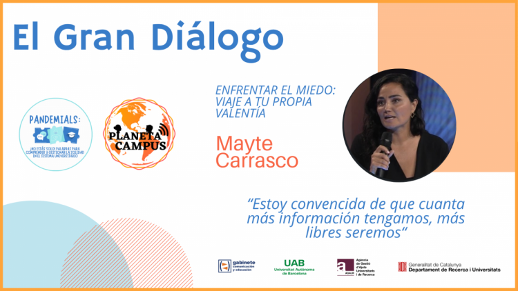 El Gabinete de Comunicación y Educación de la Universitat Autònoma de Barcelona organizó la decimotercera sesión del ciclo “El Gran Diálogo”, titulada “Enfrentar el miedo: viaje a tu propia valentía”. La jornada, que tuvo lugar el pasado jueves 10 de julio de 2025, fue protagonizada por la documentalista Mayte Carrasco y moderada por el catedrático Santiago Tejedor.
