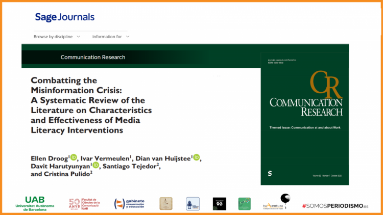Santiago Tejedor, director del Gabinete de Comunicación y Educación de la Universitat Autònoma de Barcelona y Cristina Pulido, directora del Departamento de Periodismo de la UAB e investigadora del Gabinete, junto a los investigadores Ellen Droog, Ivar Vermeulen, Dian van Huijstee y Davit Harutyunyan firman el artículo “Combatting the Misinformation Crisis: A Systematic Review of the Literature on Characteristics and Effectiveness of Media Literacy Interventions”.