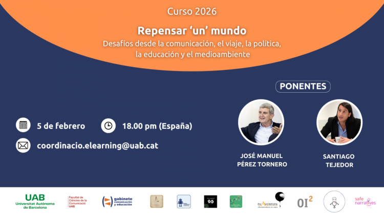 La jornada inaugural, titulada: “Repensar ‘un’ mundo. Desafíos desde la comunicación, el viaje, la política, la educación y el medioambiente”, tendrá lugar de forma virtual el próximo jueves 5 de febrero de 2026, a las 17:00, y contará con las ponencias de los catedráticos Santiago Tejedor, director del Gabinete de Comunicación y Educación y José Manuel Pérez Tornero, responsable del Programa de Cooperación en materia de Alfabetización Mediática y Diálogo Intercultural de la UNESCO.